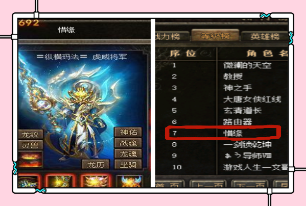 刚回归传奇的时候许多新增的技能,新地图的新玩法对 惜缘 而言都是雾里看花,但他很快就调整好了状态,因为喜爱热血传奇游戏,他便下足了功夫研究传奇,渐渐的他对于游戏攻略他有了一定的了解,闲暇之余他认真的将传奇理论联系实际,反复的琢磨演练,功夫不负有心人,很快他就 有了跨越式的突破,从一无所知,到半知半解,到了如指掌,所以后来传奇里的朋友们有什么不懂的都会去请教 惜缘 ,他总是不厌其烦耐心的回答,能以最简洁的 语言讲解游戏核心要领,让提问的游戏玩家能快速的领悟而不再为之困惑。