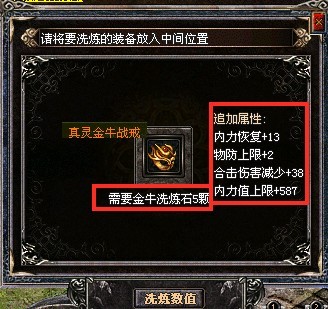 具体操作:将装备放入“洗炼数值”窗口后,根据提示,在包裹内准备好对应系列的5颗洗炼石,点击:洗炼数值 按钮。