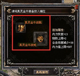 具体操作:将需要刷新追加属性的一个装备放进“主位”,提供一个相同系列阶段的装备放进“辅位”,点击:洗炼属性 按钮。
