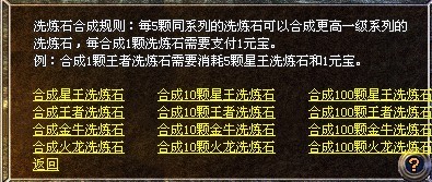 每5颗同系列的洗炼石可以合成更高一级系列的洗炼石,每合成1颗洗炼石需要支付1元宝。