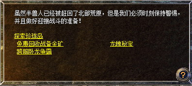 玩家可以通过盟重指挥官参加跨服卧龙争霸,通过卧龙堡主进入到卧龙入口进行准备工作,活动正式打响,将传送入卧龙山庄地图。
