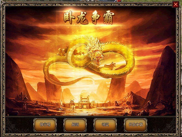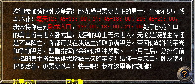 欢迎参加跨服卧龙争霸!卧龙山庄只需要真正的勇士,生命不息,战斗不止!每天12:45-13:00、17:45-18:00、20:45-21:00,卧龙堡主会将你送到卧龙入口,13:00、18:00、21:00处于卧龙入口的勇士将会进入卧龙山庄,迟到的勇士无法进入。无论是顽强生存还是不幸阵亡,你都可以在卧龙堡主这里领取争霸积分。带回你战斗的荣光和争霸积分,盟重指挥官会给你各种奖励。一周之后,总排行前十名的勇士将会获得卧龙堡主珍藏已久的宝物!给你一点忠告,卧龙山庄不仅要活着,更需要战斗!快去吧!在这里等你凯旋!