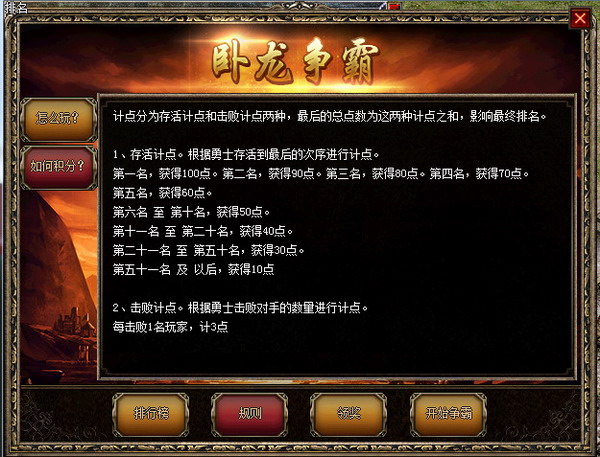跨服卧龙山庄以个人为单位,规则是在击杀其他玩家的同时保证自己存活,整个战场只剩一名勇士存活的时候,本场结束,这名存活的勇士获胜。所有勇士根据死亡的顺序和击杀的人数排名,获得奖励。