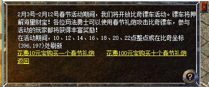 辛勤了一整年还未来得及准备年货的玛法勇士们注意了!据可靠情报,满载年货的新年镖车将在近期路过比奇城内!镖车不仅满载稀世珍宝!届时各位玛法勇士可"打劫"新年镖车"夺取"年货,见者有份先到先得!