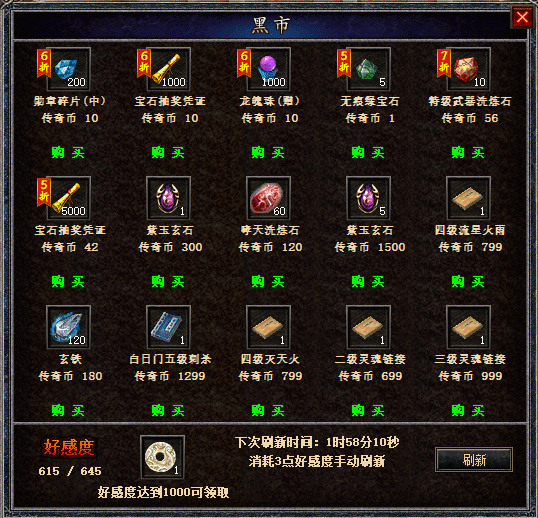 1、土城黑市每隔12小时刷新一批商品,不仅可以超值购买其中商品(绑定),还可额外获得对应价格的好感度。